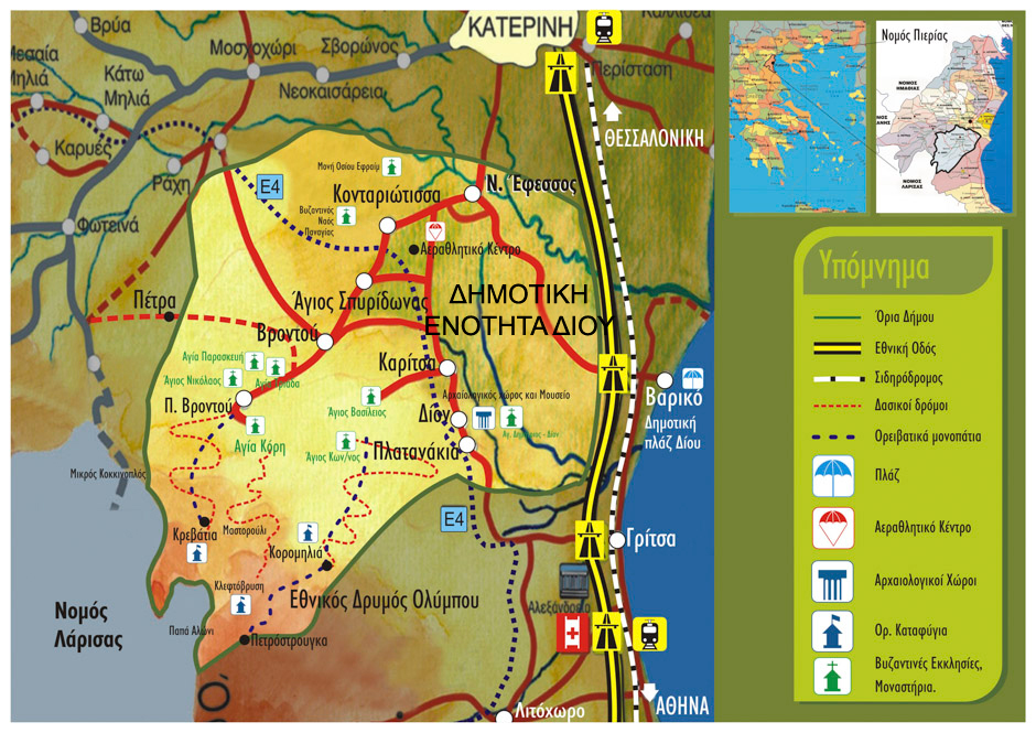 Αποτελείται από έξι Δημοτικά Διαμερίσματα, τα οποία απλώνονται σαν στεφάνι στους ανατολικούς πρόποδες του Ολύμπου. Έχει έκταση 172.743 στρέμματα και πληθυσμό 12 χιλιάδες περίπου κατοίκους. Το Δίον απέχει 6 χιλιόμετρα από τον Όλυμπο και επίσης 6 χιλιόμετρα από τις ακτές του Θερμαϊκού.Δίον. Ιστορική έδρα. Οι κάτοικοι της είναι Βλάχοι και Σαρακατσάνοι στην καταγωγή. Στο Δημοτικό Διαμέρισμα του Δίου ανήκει και ο οικισμός των Πλατανακίων με ποντίους κατοίκους.